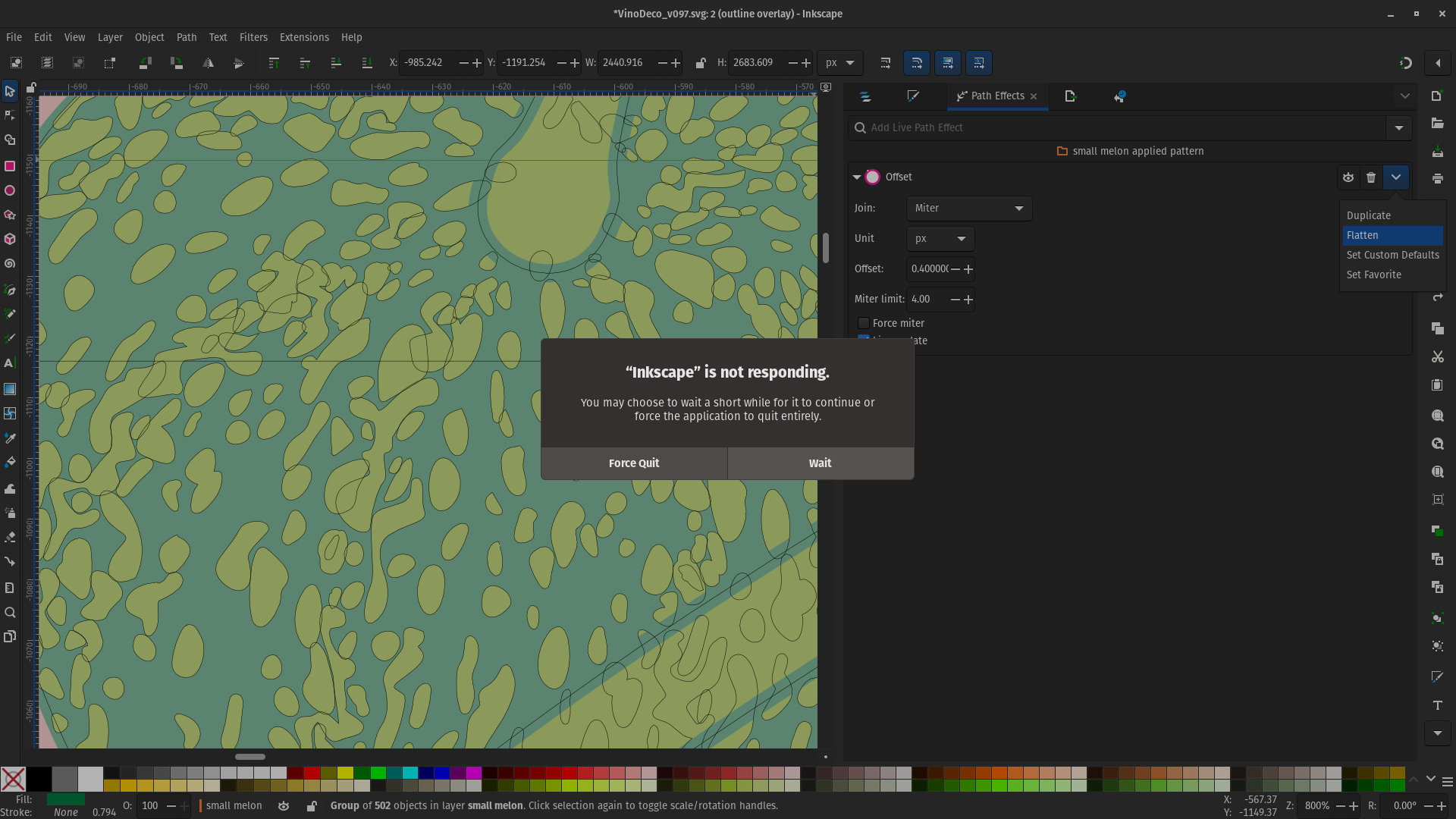 Using Inkscape’s Shape Builder tool in a hyper-specific way to get the overlapping shapes occluded just so is really quite fussy and destructive. The outlined version of this is hitting that and visual barriers as the fine tendril elements get smaller, I’m going to have to find a different solution in the design language or go with flat colors. It’s not a terrible look but I like the line design as well. I’ll definitely revisit this later, line and vine widths in particular.