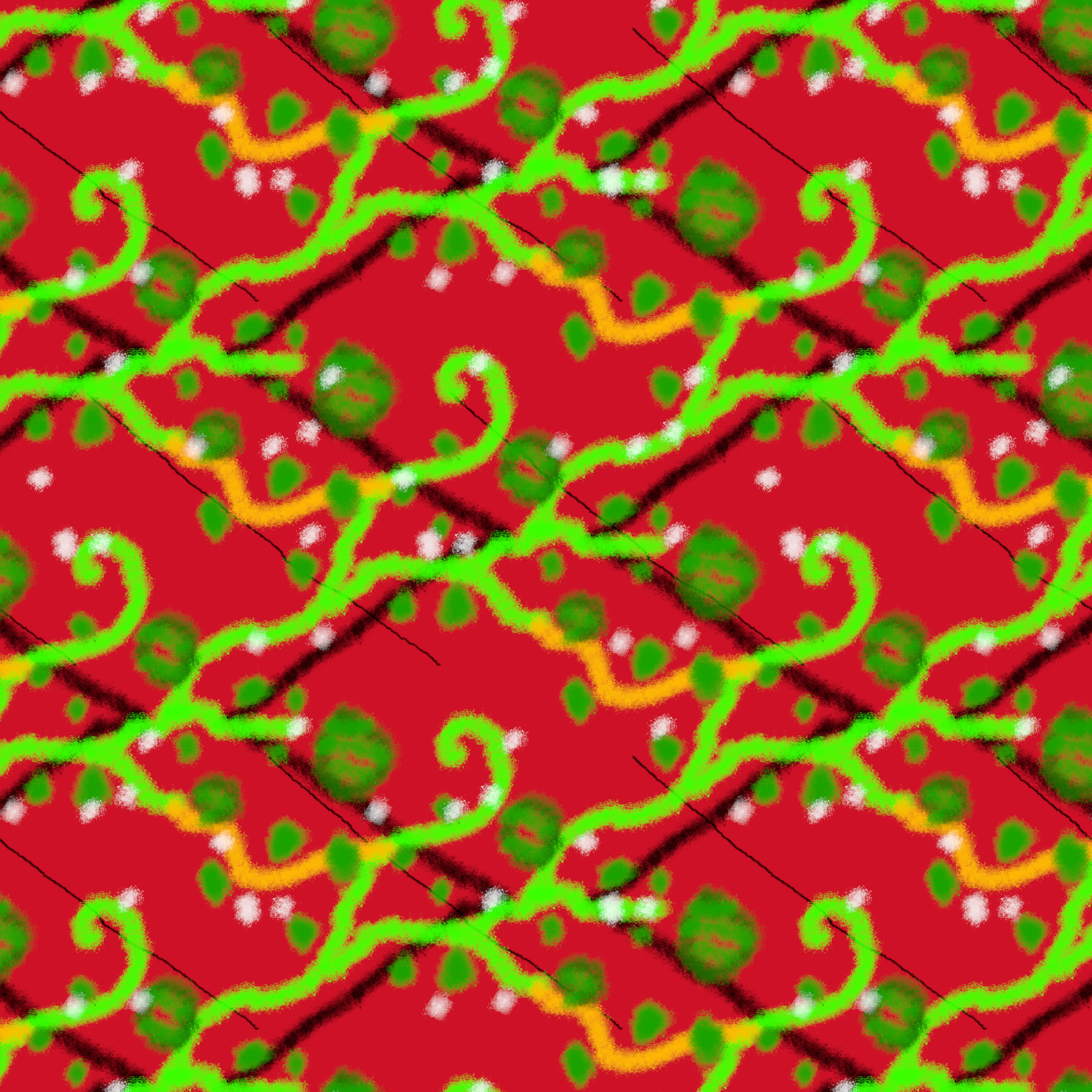 Some doodles and early tiling technical exercises to figure out the software behavior, this culminates in later refinements of this watermelon vine pattern as well as the tutorial I have published on tiling / Surface Design in Inkscape which if I recall features some notes on GIMP and Krita as well. Generally, any of these tiles can be previewed in GIMP, checking for errors and continuity, using the Offset tool dialogue at Layers > Transform > Offset. This works on one flattened layer at a time.